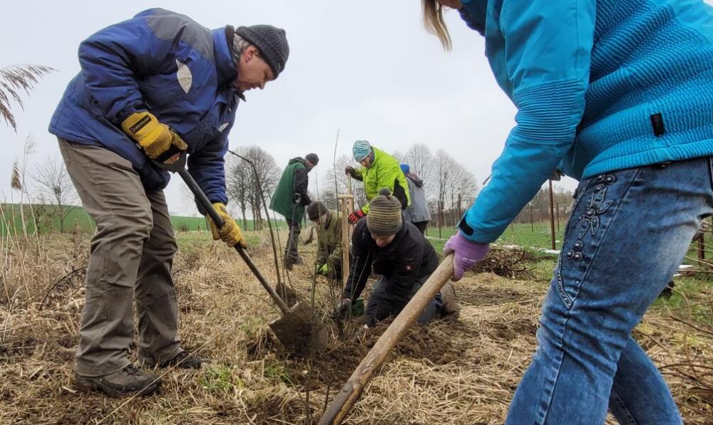 Hier, auf einer Wiese am Dorfrand, hat Jan-Hendrik Hartinger, Landwirt im Nebenerwerb, zahlreiche Obstbäume angepflanzt. Um diese zu schützen und gleichzeitig kleinen Tieren und Insekten Lebensraum zur Verfügung zu stellen, haben die Freiwilligen hier auf einer Länge von über 300 Metern insgesamt etwa 800 Sträucher in die Erde gebracht.